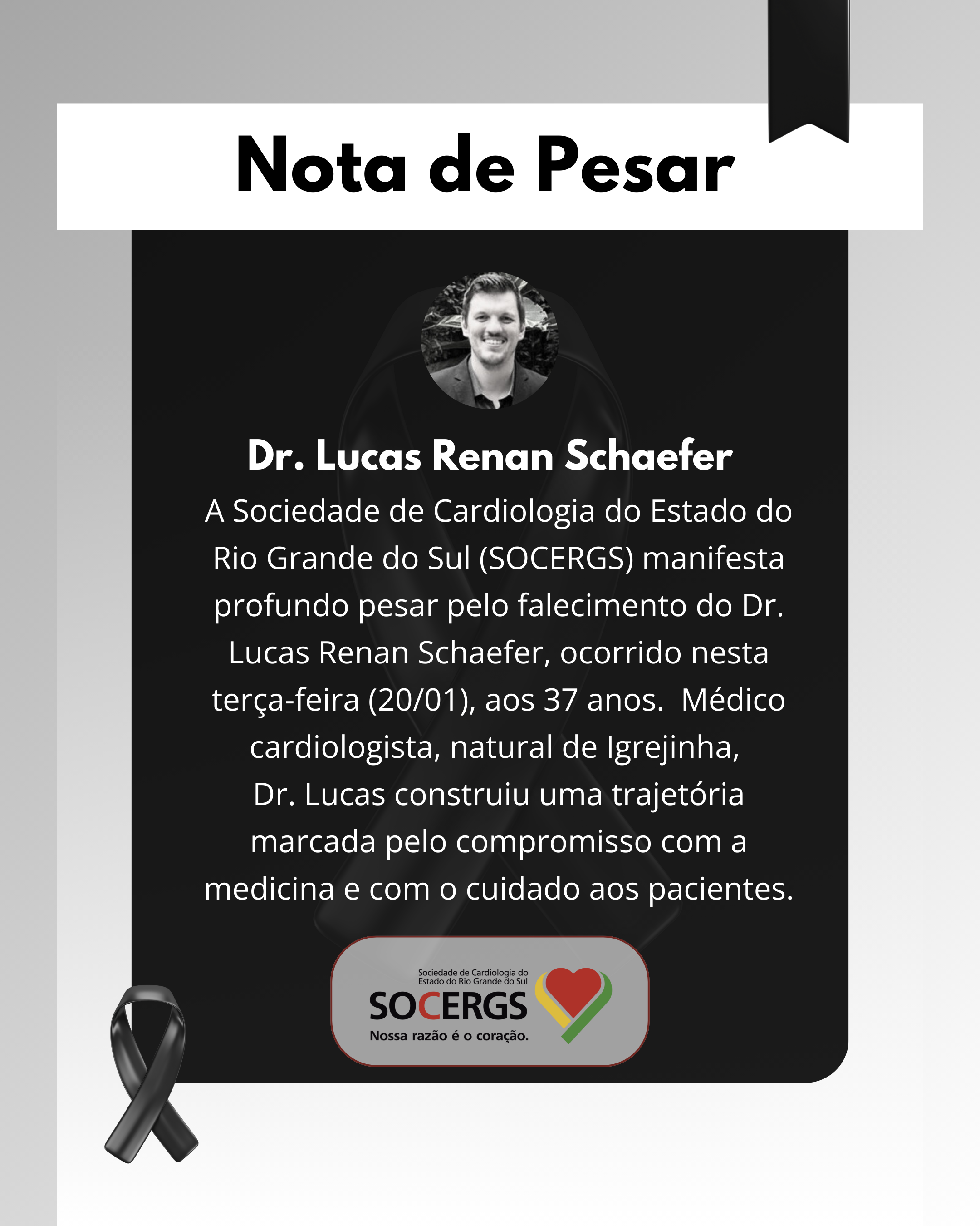 A Sociedade de Cardiologia do Estado do Rio Grande do Sul (SOCERGS) manifesta profundo pesar pelo falecimento do médico cardiologista Lucas Renan Schaefer, ocorrido nesta terça-feira (20/01), aos 37 anos, em decorrência de um infarto. Natural de Igrejinha, Dr. Lucas construiu uma trajetória marcada pelo compromisso com a medicina e com o cuidado aos pacientes. Realizou residência médica em Cardiologia no Instituto de Cardiologia, entre 2017 e 2019, e integrou a equipe da emergência e da UTI daquele hospital. Ao longo de sua carreira, manteve vínculos profissionais em Porto Alegre e no interior do Estado, conciliando atendimentos e atividades médicas com dedicação e ética.