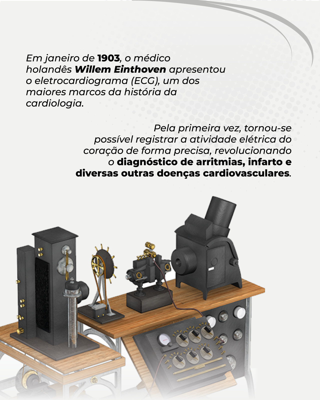 Em janeiro de 1903, o médico holandês Willem Einthoven apresentou o eletrocardiograma (ECG), um dos maiores marcos da história da cardiologia. Pela primeira vez, tornou-se possível registrar a atividade elétrica do coração de forma precisa, revolucionando o diagnóstico de arritmias, infarto e diversas outras doenças cardiovasculares.