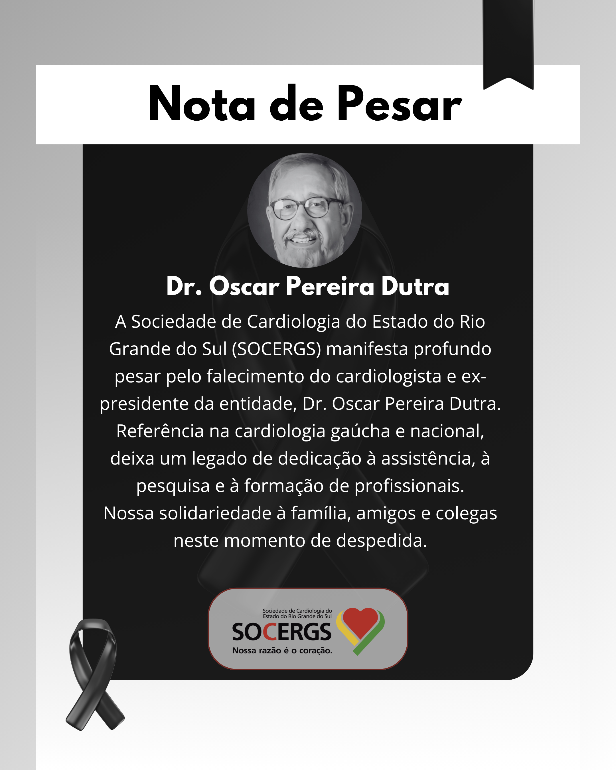 A Sociedade de Cardiologia do Estado do Rio Grande do Sul (SOCERGS) manifesta profundo pesar pelo falecimento do cardiologista Dr. Oscar Pereira Dutra, ocorrido no dia 21 de março de 2026. Referência na medicina cardiovascular no Rio Grande do Sul e no cenário nacional, Dr. Oscar também teve atuação destacada na liderança da especialidade, tendo sido presidente da Sociedade Brasileira de Cardiologia e da SOCERGS na gestão 2002/2003.